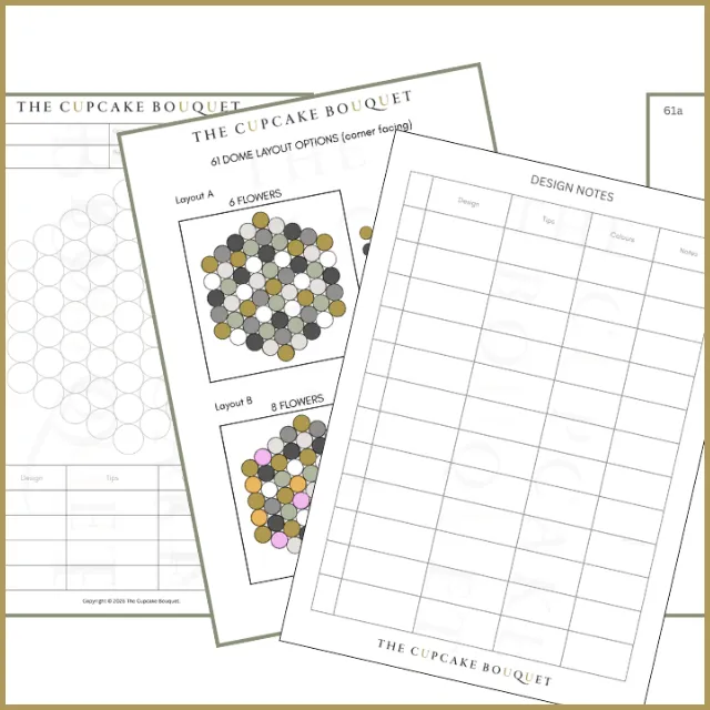 Whether you have decided on 6 different blooms or 8 different blooms, this document will show you exactly how to place your 61 cupcakes. This sheet is invaluable!