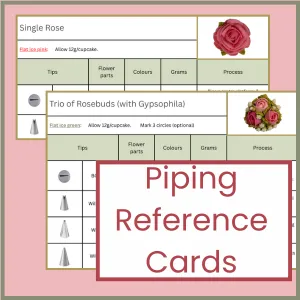 Including a reference card for each flower to remind you of the quantities, tips, colours and piping techniques.